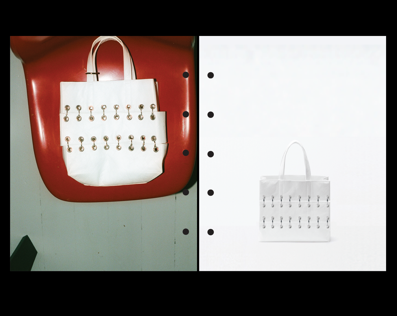 The binder rings act as both structure and symbol — they connect, detach, and reconfigure, allowing the bag to adjust to two different sizes.