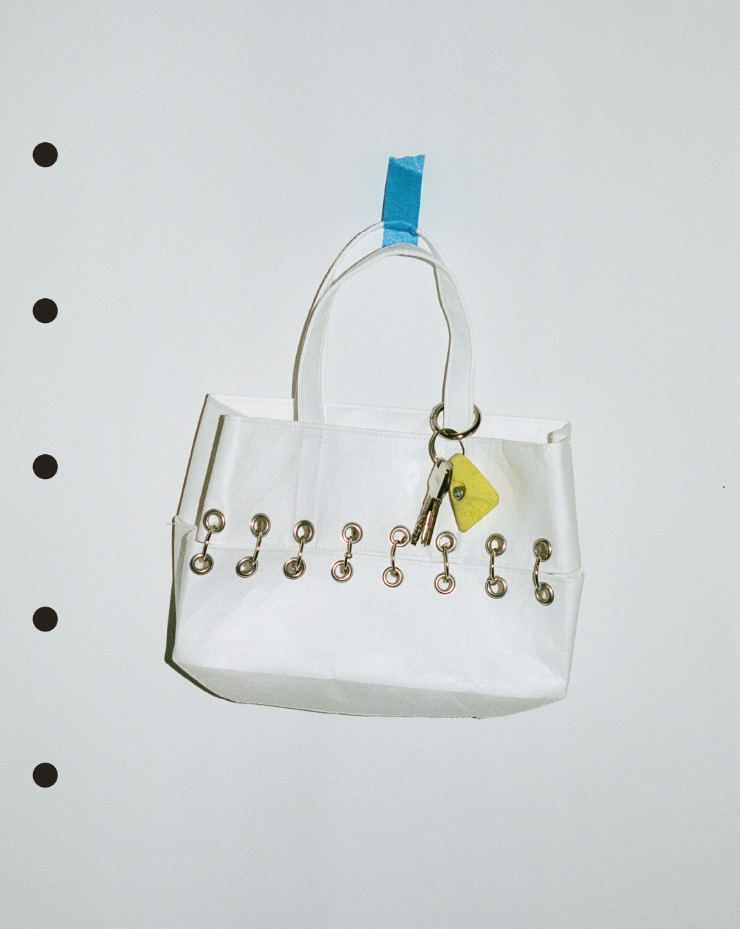 The binder rings act as both structure and symbol — they connect, detach, and reconfigure, allowing the bag to adjust to two different sizes.